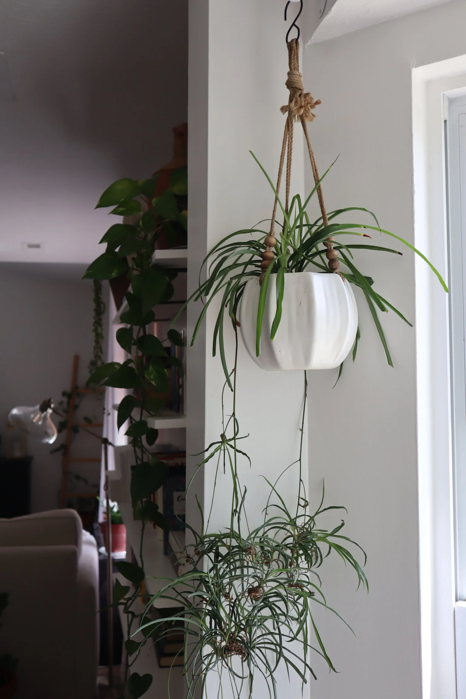One of my favorite things about air-purifying plants is how well they mix and match. For example, my spider plant pairs beautifully with my pothos on a nearby shelf — the two have different shapes and growth habits, but together they create a lush, layered look.