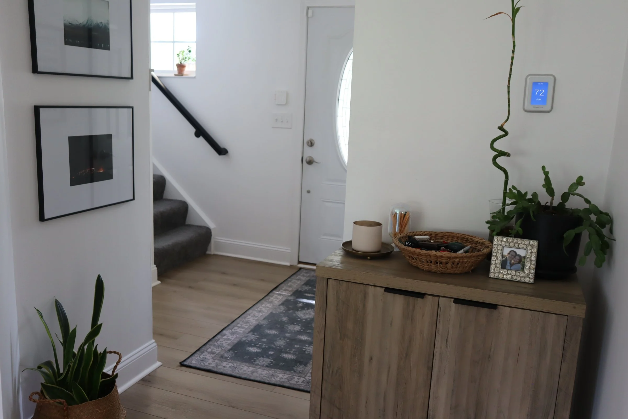 Just around the corner from the door, I added a low-profile storage cabinet that holds shoes neatly out of sight. This has been a game changer for keeping our entryway clutter-free. On top of the cabinet, I placed a small woven bowl that acts as a catch-all for keys, lip balm, or whatever else ends up in your hands when you walk in the door.
