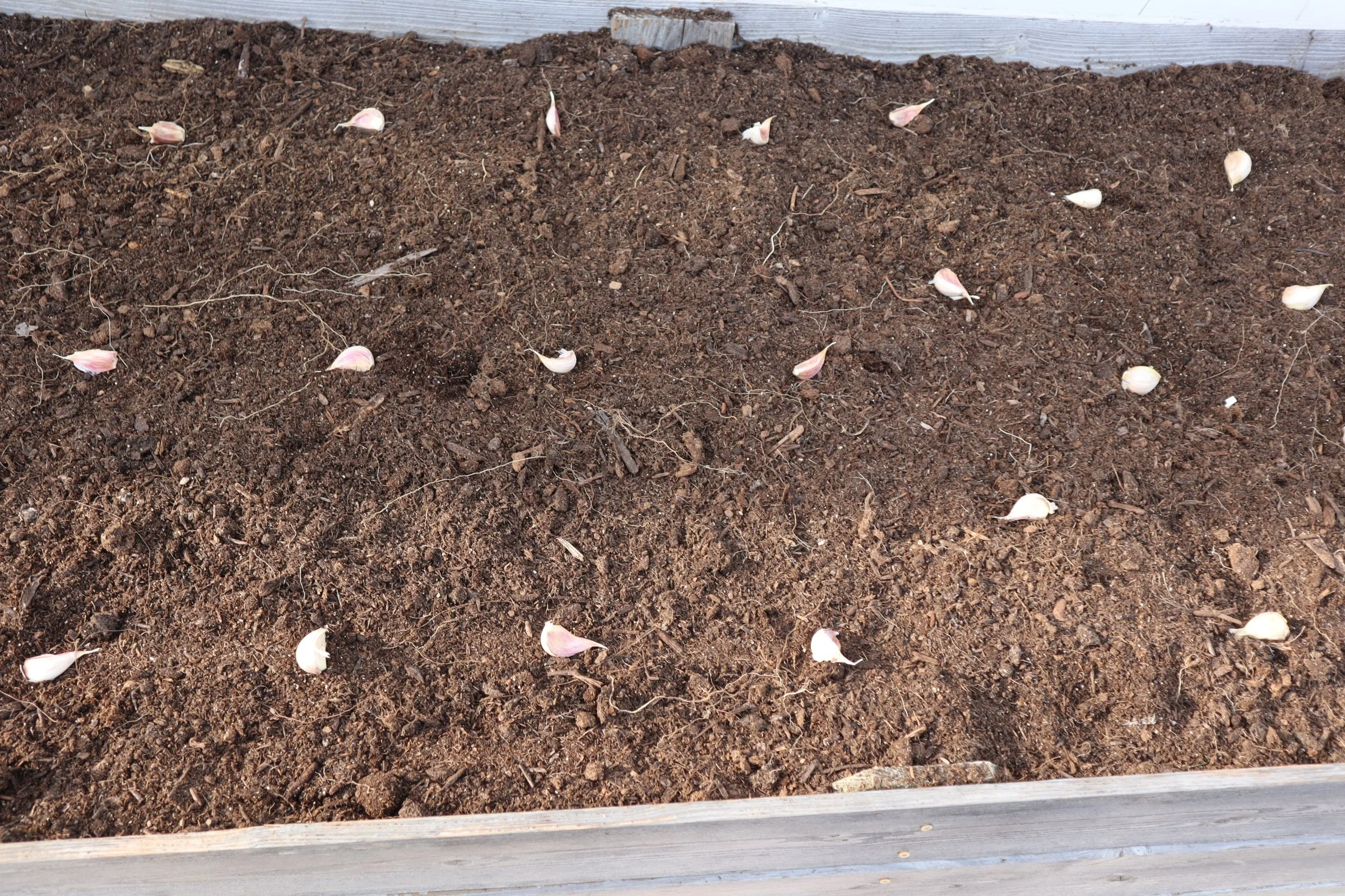 Once our cloves were ready, we laid out the garden bed for planting. Garlic needs space to grow, and 6 inches apart is the ideal distance for most varieties.