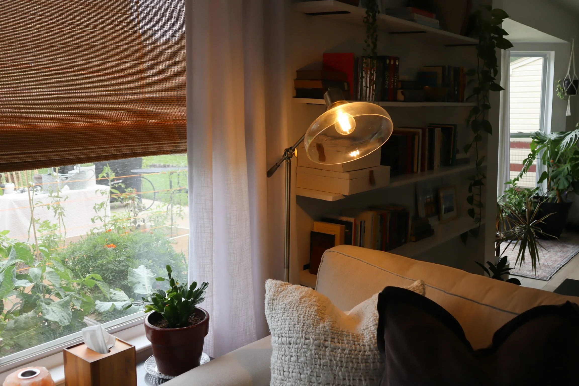 Then, as the day winds down, use sheer curtains, linen drapes, or woven shades to filter harsh evening light or streetlight glare. This helps your home feel private, peaceful, and calm.